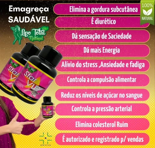 Star Vip Black é um suplemento emagrecedor de alta performance, desenvolvido para quem busca resultados rápidos e eficazes na perda de peso. Com uma fórmula exclusiva que combina ingredientes potentes como Evodiamina, Flor de Lótus, Funcho, Laranja Moro, Café Verde, Garcinia Cambogia, Linhaça, Pholia Negra, Psyllium, Picolinato de Cromo, Vitamina C e Vitamina E, Star Vip Black atua como um inibidor de apetite poderoso, acelerando o metabolismo e promovendo a queima de gordura. Basta uma cápsula ao dia para sentir os efeitos transformadores deste suplemento na sua jornada de emagrecimento.
